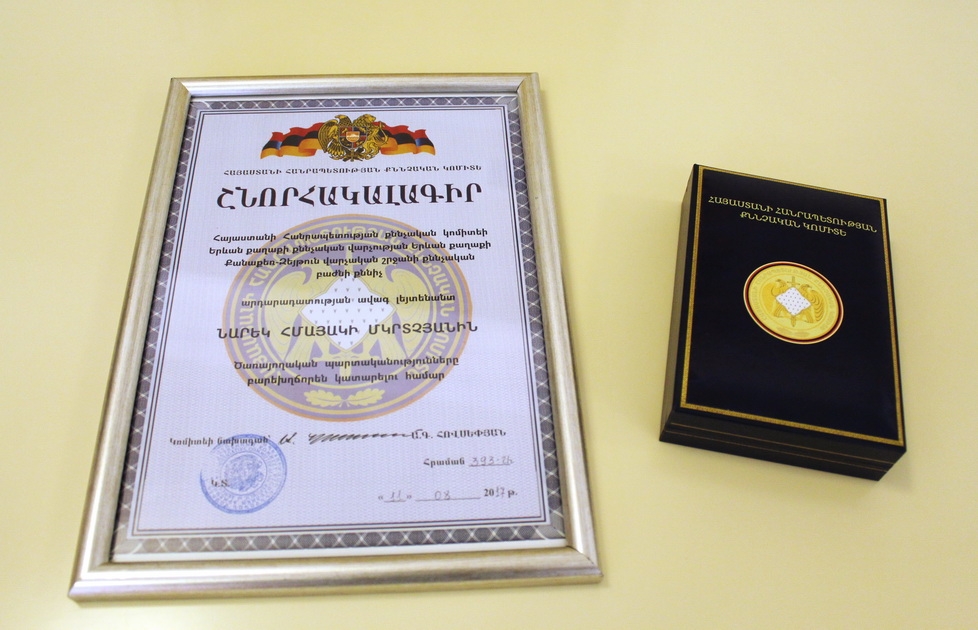 ՀՀ ՔԿ նախագահ Աղվան Հովսեփյանը հրաման է ստորագրել՝ ՀՀ ՔԿ Երևան քաղաքի քննչական վարչության Քանաքեռ-Զեյթուն վարչական շրջանի քննչական բաժնի երկու քննիչի խրախուսելու մասին՝ ծառայողական պարտականությունները բարեխղճորեն կատարելու համար: