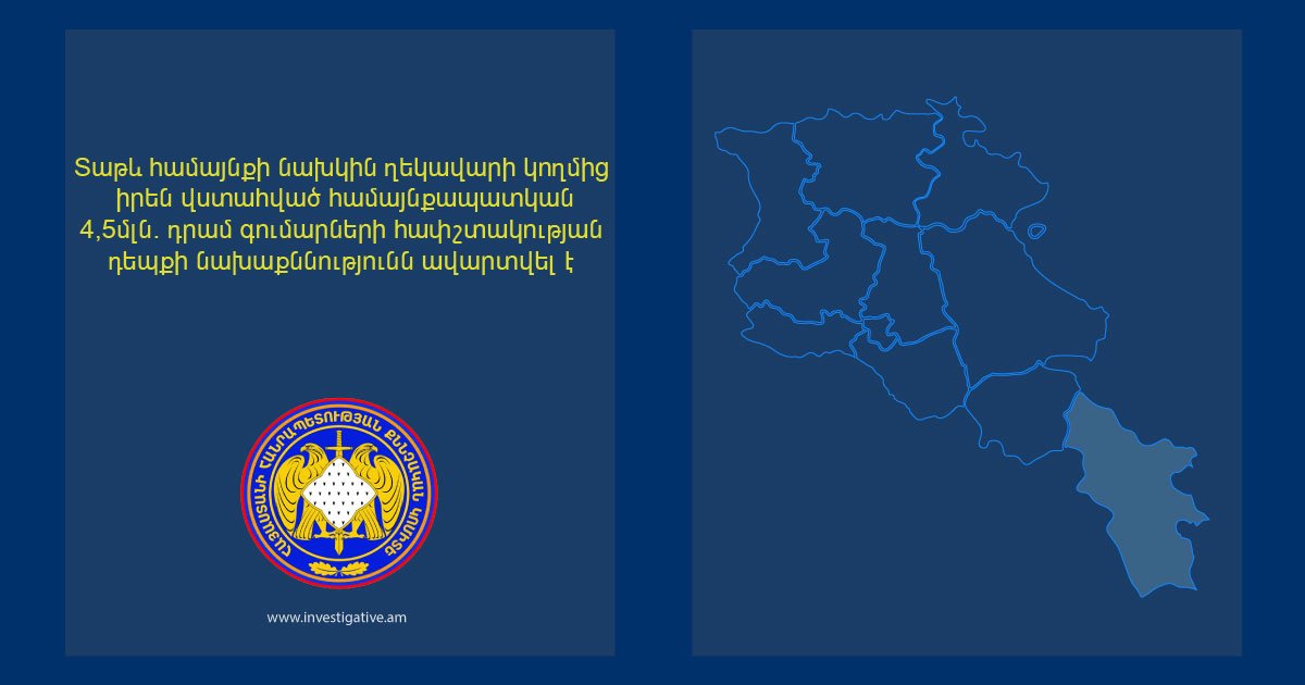 ՀՀ քննչական կոմիտեի Սյունիքի մարզային քննչական վարչության Գորիսի քննչական բաժնում իրականացված քննչական և վարութային գործողությունների արդյունքում ձեռք բերված փաստական տվյալներով հիմնավորվել է, որ Տաթև համայնքի նախկին ղեկավարը, 2016թ. փետրվարից մինչև 2021թ. փետրվարն ընկած ժամանակահատվածում զբաղեցնելով հիշյալ պաշտոնը, օգտագործելով ծառայողական լիազորությունները և դրանից բխող հեղինակությունը, կատարել է իրեն վստահված խոշոր չափերով գույքի հափշտակություն: