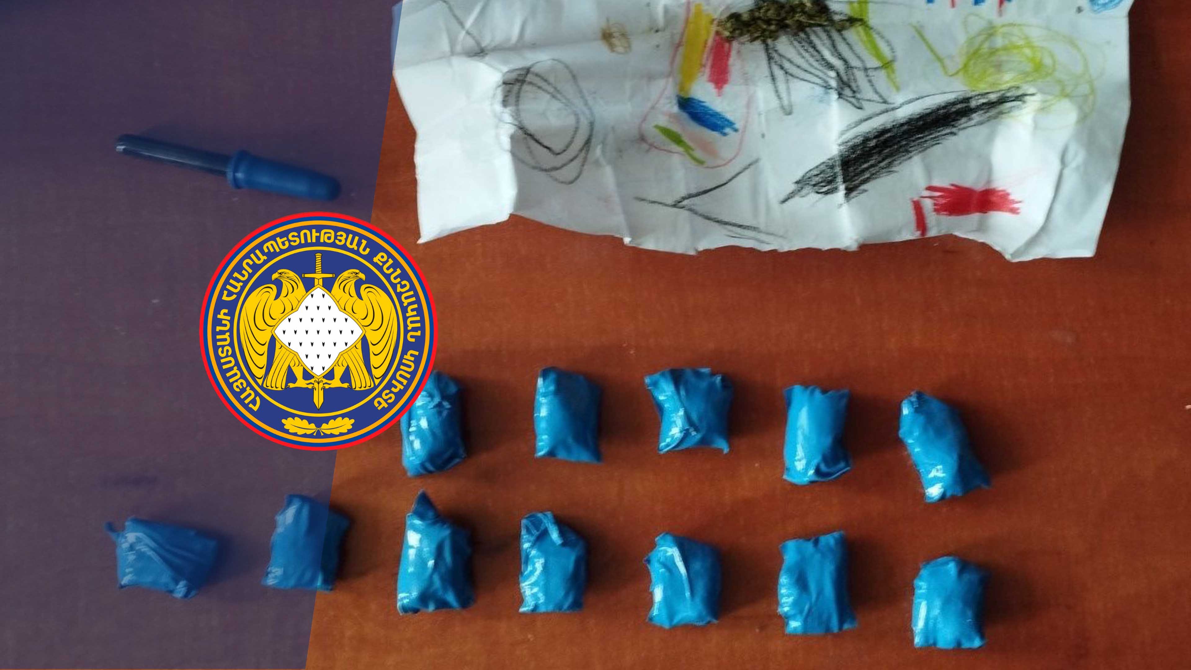 Վերջինիս անձնական խուզարկությամբ հայտնաբերվել է 14 փաթեթներում առանձնացված, ընդհանուր 6 գրամ քաշով դեղնականաչավուն զանգված, բժշկական մեկ կաթոցիչ՝ մոխրացած հետքերով։
