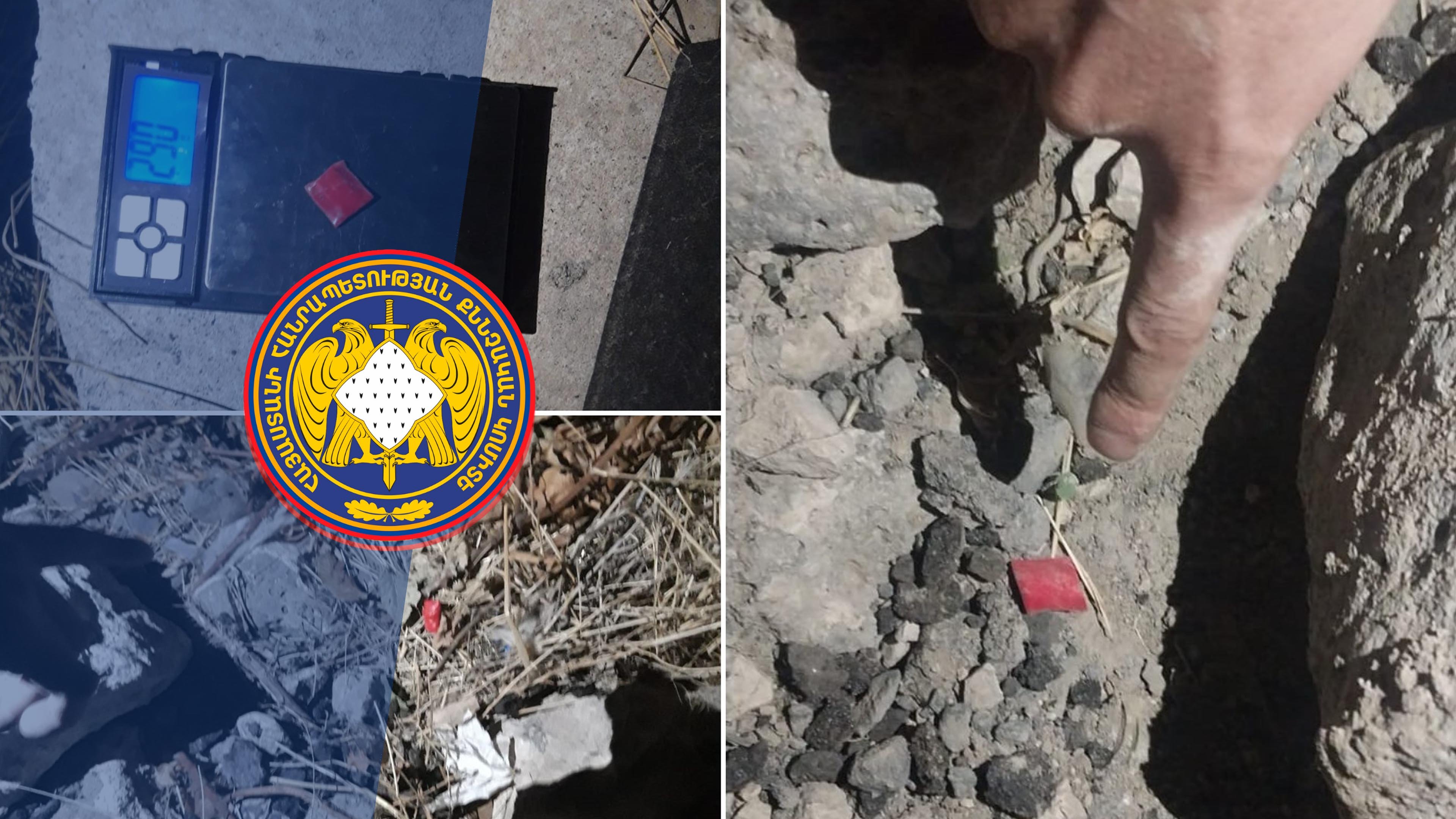 Վարույթի շրջանակներում 29-ամյա տղամարդը մատնանշել է այն վայրերը, որտեղ տեղադրել է թմրամիջոցները. նրա մասնակցությամբ կատարվել է դեպքի վայրի զննություն, որտեղ հայտնաբերվել և վերցվել է նրա կողմից տեղադրված թմրամիջոցների 5 փաթեթ: Ըստ ձերբակալվածի՝ նշված փաթեթներից չորսի պարունակությունը «Կրիստալ» տեսակի, մեկինը՝ «Մարիխուանա» տեսակի թմրամիջոց է: