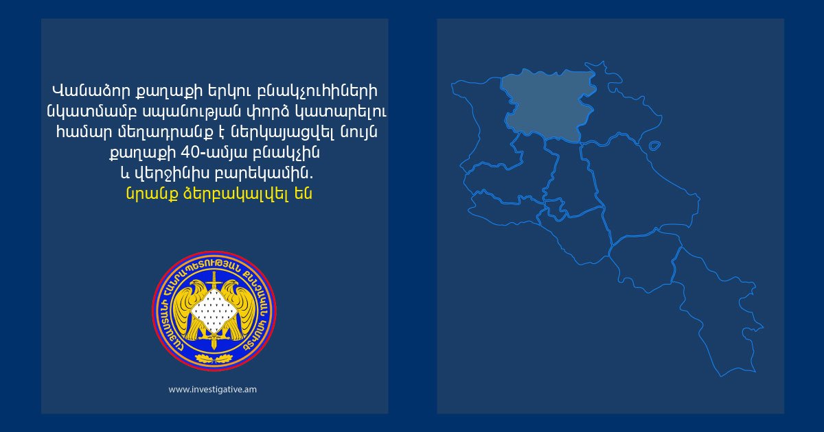 Վանաձոր քաղաքի երկու բնակչուհիների նկատմամբ սպանության փորձ կատարելու համար մեղադրանք է ներկայացվել նույն քաղաքի 40-ամյա բնակչին և վերջինիս բարեկամին․ նրանք ձերբակալվել են
