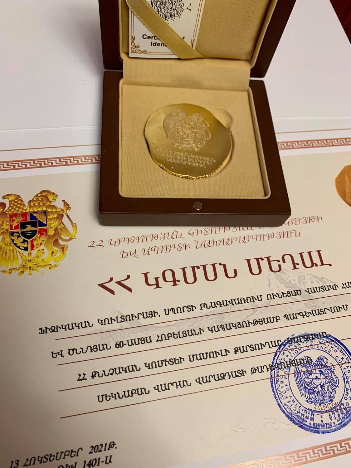 ՀՀ քննչական կոմիտեի նախագահի մամուլի քարտուղար, մարզական մեկնաբան Վարդան Թադևոսյանը ֆիզիկական կուլտուրայի, սպորտի բնագավառում ունեցած վաստակի համար և ծննդյան 60-ամյա հոբելյանի կապակցությամբ ՀՀ ԿԳՄՍ նախարարի՝ 2021թ. հոկտեմբերի 13-ի հրամանով պարգևատրվել է ոսկե մեդալով: