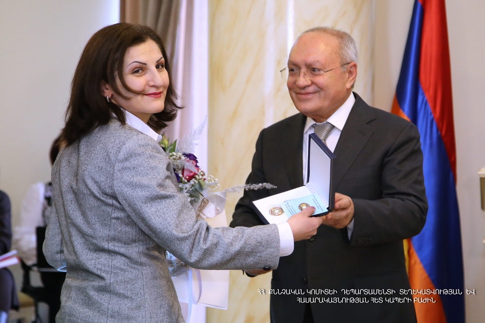 Based on the results of discussions the RA IC Chairman Aghvan Hovsepyan awarded senior investigator of particularly important cases of the RA IC Syuniq Regional Investigative Department Narine Hovhannisyan and investigator of particularly important cases of the RA IC Lori Regional Investigative Department Hrachik Poghosyan with a Medal of the fourth degree “For Impeccable Service” for providing comprehensive, objective and complete investigation of criminal cases on domestic violence, taking the peculiarities of the criminal case, the risk for the affected to become double affected into consideration, as well as choosing a correct methodology into consideration.