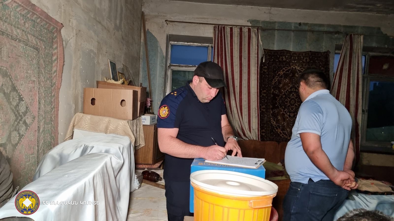 Վարույթի շրջանակներում, ձերբակալվածի մասնակցությամբ, կատարվել է դեպքի վայրի զննություն, որի ընթացքում նա մատնացույց է արել վայրը, որտեղ խոհանոցային դանակով հարվածել է որդու պարանոցին, հայտնաբերվել են արնանման հետքեր, կատարվել նմուշառումներ, առգրավվել է հանցագործության գործիք հանդիսացող դանակը, ինչպես նաև՝ դեպքի պահին տուժողի և վերջինիս հոր հագին եղած հագուստները: