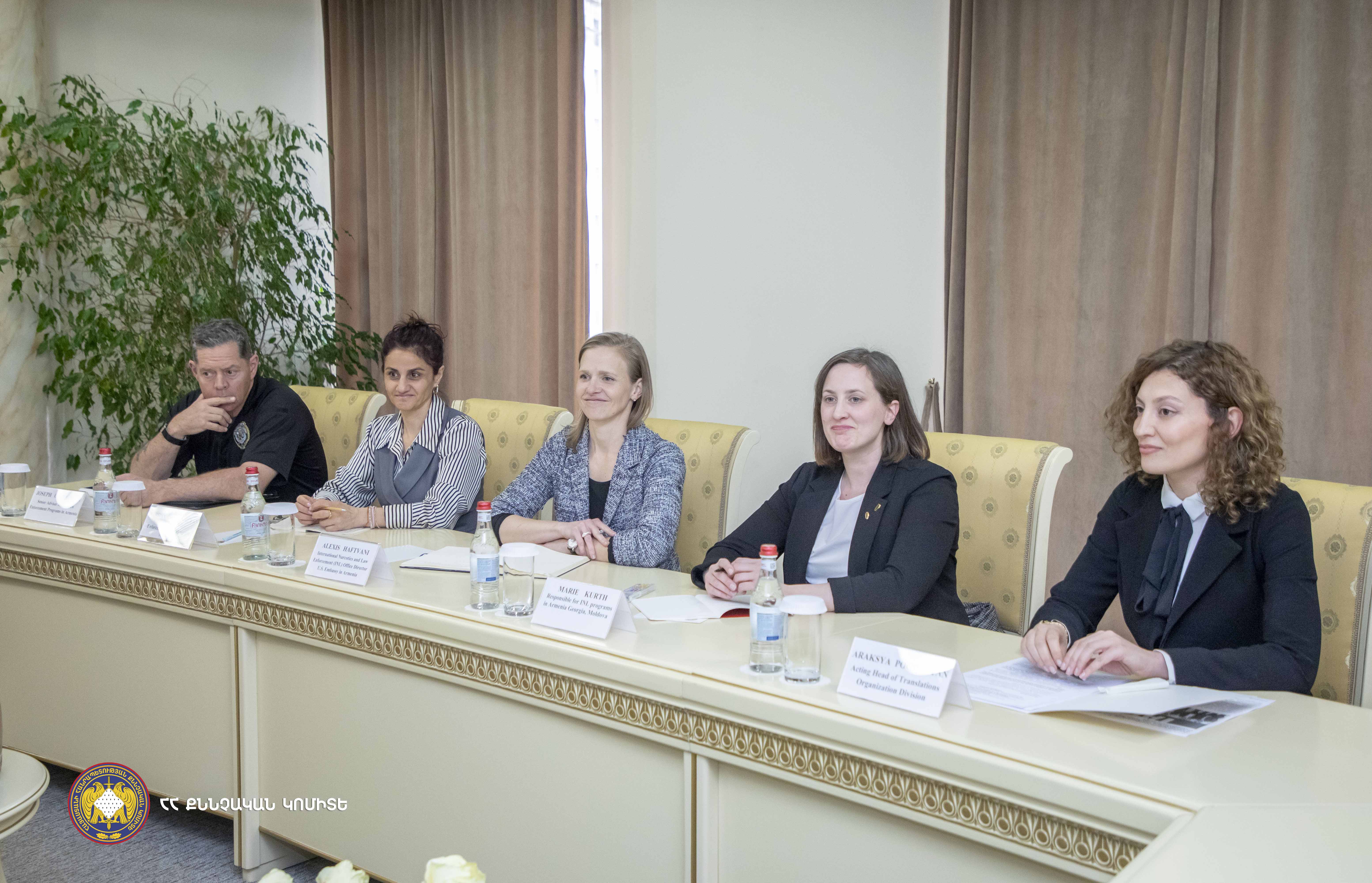 ՀՀ քննչական կոմիտեի նախագահի տեղակալ Արսեն Այվազյանն ընդունել է Ամերիկայի Միացյալ Նահանգների թմրամիջոցների և իրավապահ համագործակցության (ԹՊԻՀ) դեպարտամենտի՝ Հայաստանում, Վրաստանում և Մոլդովայում ծրագրերի պատասխանատու Մարի Կուրթին, որին ուղեկցում էր ՀՀ-ում ԱՄՆ դեսպանատան պատվիրակությունը՝ դեսպանատան ԹՊԻՀ գրասենյակի տնօրեն Ալեքսիս Հաֆտվանիի գլխավորությամբ։